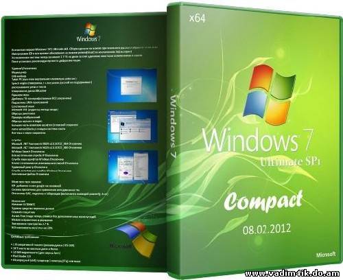 Компактная версия Windows 7 SP1 Ultimate х64. Сборка сделана на основе оригинального русского образа от 12.05.2011. Интегрирован IE9 и все важные обновления на момент релиза(68шт) за исключением 3х(см.скрин). Установленная система теперь занимает 2.7 ГБ на диске за счет удаления некоторых компонентов и сжатия."