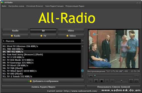 | All-Radio - это многофункциональная программа для прослушивания радио через интернет, а также просмотра ТВ и видео. All-Radio распространяется совершенно бесплатно (в программу встроен рекламный баннер, потому за ее использование платит не пользователь, а рекламодатель). Если Вы увлекаетесь прослушиванием радио через интернет или просмотром ТВ и видео, то, наверное, знаете, сколько времени уходит на поиск необходимых станций. All-Radio создана для того, чтобы помочь Вам минимизировать это время. All-Radio – представляет собой программную оболочку, взаимодействующую с пятью серверами баз данных (на которых находятся списки радио- и ТВ-станций). Соединение с ними происходит автоматически при запуске программы. Поэтому Вам не придется самостоятельно искать станции в интернете, All-Radio нашел их за Вас - Вам достаточно лишь запустить программу и выбрать необходимую станцию для прослушивания радио через интернет или просмотра ТВ из предложенного списка. All-Radio на сегодняшний день является наиболее удобной программой для прослушивания радио через интернет, просмотра ТВ и видео. Имеет интуитивно понятный интерфейс и не требует какого-либо дополнительного обучения для работы. Возможности программы: Запись в формате MP3 с битрейтом от 32 до 320 (сохраняется в папке recordings) Запись MP3 в формате моно, стерео, j-стерео Ограничение записи MP3 в минутах Автоматическое обновление списка станций Функция избранного Возможность добавления своих станций в избранное Возможность отправки своих станций на сервер (будут добавлены в списки после проверки администратором) Возможность записи потокового видео (кроме флеша) Ограничение записи потокового видео в мегабайтах Поддержка прокси (действует только для модуля записи видео) Поддержка ввода пароля (при смене пароля базы) Поддержка 15 серверов баз данных (базы данных на 15 серверах) Информация о программе: Релиз выпущен: 2013 Платформа: Windows® 8/XP/Vista/7 Язык интерфейса: русский Лекарство: Присутствует Размер файла: 30,36 МБ | |