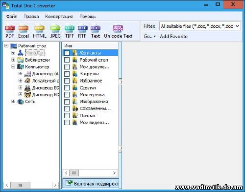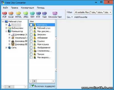 | Total Doc Converter решает проблему конвертирования Doc файлов в PDF, HTML, XLS, JPG, TIFF или Text. Total DOC Конвертер умеет приводить все DOC файлы к единому форматированию. Если у вас 1000 doc файлов и у всех разное форматирование, просто задайте нужные настройки в Total DOC Converter. Программа обработает все файлы автоматически, и на выходе Вы получите документы с одинаковым форматированием. Total DOC Конвертер была разработана для удобства и экономии времени пользователя. Прозрачный интерфейс позволяет даже новичку с легкостью разобраться с принципами функционирования утилиты. Вам даже не придется запускать программу. Вы можете конвертировать Word файлы прямо с рабочего стола. Total Doc Converter интегрируется в Windows. Все, что Вам нужно сделать - это нажать правую клавишу мыши на нужном файле и выбрать Convert to. Автоматически появится окно программы, где Вы сможете задать все необходимые параметры конвертации. Вы можете вообще не вызывать пользовательский интерфейс программы, работая с командной строки. Вы оцените Total Doc Конвертер, когда Вам придется конвертировать сотни файлов. Используйте опцию одновременного конвертирования множества файлов, и процесс займет не больше времени, чем преобразование одного файла. Загрузите программу бесплатно и убедитесь в том, что это лучшее решение преобразования doc файлов. Полный список поддерживаемых преобразований: Doc в PDF, Doc в HTML, Doc в XLS, Doc в Jpeg, Doc в Tiff, Doc в Text, RTF в PDF, RTF в HTML, RTF в XLS, RTF в Jpeg, RTF в Tiff, RTF в Text, DocX в PDF, DocX в HTML, DocX в XLS, DocX в Jpeg, DocX в Tiff, DocX в RTF, DocX в Text, TXT в PDF, TXT в HTML, TXT в XLS, TXT в Jpeg, TXT в Tiff, TXT в юникодный TXT. Информация о программе: Релиз выпущен: 2013 Платформа: Windows® 8/XP/Vista/7 Язык интерфейса: русский Лекарство: Присутствует Размер файла: 10 МБ | |