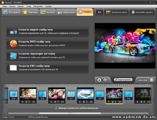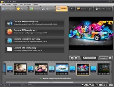 | ФотоШОУ - это удобная программа для создания музыкальных слайд-шоу с красивыми эффектами переходов. Позволяет добавлять неограниченное число фотографий, вставлять подписи и титры, использовать темы оформления и многое другое. Подготовленные слайд-шоу можно сохранить в виде EXE-файла, скринсейвера или видео, в том числе full HD. Программа даёт возможность сделать увлекательный мультимедийный альбом из любых фотографий. Множество опций, десятки разнообразных эффектов и индивидуальные настройки каждого слайда откроют новые горизонты для вашего творчества. ФотоШОУ идеально подходит для превращения фотографий в музыкальные видеоролики, создания фото-презентаций продукции и даже мультимедийных открыток. Готовое слайд-шоу можно конвертировать в видео различных форматов - для публикации в Интернет (YouTube, RuTube, ВКонтакте), просмотра на мобильных устройствах (PSP, смартфонах, коммуникаторах), а также в HD-формат для зрелищного просмотра на экранах большого размера. Начиная с версии 2.0 в ФотоШОУ появилась функция записи на DVD. ФотоШОУ включает уникальную функцию виртуального экрана, позволяющую ярко и необычно оформить ваше слайд-шоу. При этом фотографии будут появляться на экране виртуального кинотеатра, телевизора или рекламного щита. Данная возможность позволяет также создавать удивительные видео открытки из ваших фото. Новая ФотоШОУ имеет также целый спектр дополнительных возможностей: Динамические эффекты, позволяющие "оживить" любые фотографии Возможность размещения видео слайд-шоу на сайтах в формате FLV Готовые тематические шаблоны слайд-шоу со встроенными эффектами Простая обрезка музыкальных треков Наглядное и удобное редактирование слайдов Информация о программе: Релиз выпущен: 2013 Платформа: Windows® 8/XP/Vista/7 Язык интерфейса: русский Лекарство: Присутствует Размер файла: 59,28 МБ | |
