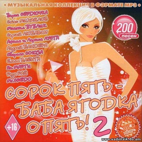 | Категория: Сборник Исполнитель: VA Альбом: Сорок Пять - Баба Ягодка Опять! - 2 (2013) Стиль музыки: Поп Дата выхода: 2013 Кол-во треков: 200 Качество|Битрейт: mp3 | 128 kbps Время : н/д Размер файла: 697 MB Треклист: 001 Верка Сердючка - Розовый Свитер (#Switter) 002 Стас Михайлов - Ты одна 003 Михаил Бублик - Будет светло 004 Елена Ваенга - Я тебя поцеловала 005 Mr.Credo - 8 марта 006 Кабриолет - Между небом и землей 007 Афина и Лариса Луста - Я женщина 008 Сборная Союза - 8 Марта Мужики! 009 Весна - Белые крылья любви 010 Михаил Шуфутинский - За милых дам! 011 Катерина Голицына - Поздновстреченный 012 Ян Марти - Постоянно не постоянная 013 Рада Рай - Звездочка 014 Андрей Бандера - Мне бы 015 Игорь Саруханов - 8 Марта 016 Сергей Любавин - Последняя любовь 017 Ани Лорак - С первого взгляда 018 Евгений Анегин Пожалей меня 019 Братья Борисенко - На миллионы одна 020 Ирина Круг - Моя королева, моя любовь 021 Евгений Росс - Прости мою любовь 022 Ольга Стельмах - Любовь не знает границ 023 Валерий Курас - Девушка с глазами цвета неба 024 Игорь Колюха - Красивая 025 Михаил Бублик - Потанцуем 026 Елена Ваенга - Желаю 027 Ян Марти - Леночка 028 Алексей Брянцев - Без нежности твоей 029 Рада Рай - Все сбылось 030 Виктор Королев и Яна Павлова - Девчонка рыжая 031 Екатерина Шаврина и Сергей Переверзев - Моя любовь 032 Игорь Корнилов - Чудо моя женщина 033 Михаил Шуфутинский - Милая жена 034 Стелла Джанни - Солнце мое 035 Олег Алябин - Самая красивая 036 Владимир Харламов - Одной тебе 037 Игорь Слуцкий - Рябина 038 Сергей Куренков - Женщина 039 Демидыч - Она по берегу идет по голубому 040 Кабриолет - Песню нежно напевала 041 Генадий Либгардов - Моя ты королева 042 Сергей Сухачев - Ты у меня одна 043 Евгений Алтайский - За женщин 044 Гарик Кричевский - Родная 045 Сергей Трофимов - Город в пробках 046 Виктор Королев - Хрустальный замок 047 Штар - Синий лед 048 Любовь Успенская - Рябиновая настоечка 049 Анатолий Делеу - Ясные дни 050 Стас Михайлов - Ты только для меня 051 Весна - Самый близкий человек 052 Михаил Бублик - Артобстрел 053 Семен Канада - Позови меня в гости 054 Татьяна Маркова - Я закрываю глаза 055 Сергей Куприк - Хризантемы белые 056 Владимир Асмолов - Рядом быть хочу 057 Игорь Пермский - Я боюсь в тебя влюбиться 058 Сборная Союза - Ты мой человек 059 Юра Магомаев - Не оставляй меня 060 Андрей Бандера - Шереметьево 061 Сергей Славянский - Зацелую 062 Рада Рай - Гуси-Лебеди 063 Виктор Королев - Карие глаза 064 Стелла Джанни - За кулисами счастья 065 Михаил Задорин - Красивая 066 Артур - Забыть нельзя 067 Евгений Чужой - Звездочка 068 Алексей Порхачев - Тебе одной 069 Владимир Ухтинский - Женщина 070 Сергей Сердюков - Одна на всей земле 071 Весна - Свободная любовь 072 Сергей Пинсон - Поцелуй 073 Александр Шапиро - Будь со мной 074 Натали - О боже какой мужчина 075 Стас Михайлов - Только ты 076 Вадим Казаченко - Люблю 077 Тимур Темиров - Небо над землей 078 Михаил Шелег - Женщина улыбается 079 Александр Стволинский - Женщина любимая моя 080 Олег Гаврилюк - Твои глаза 081 Владимир Гунбин - Глаза небесного разлива 082 Андрей Морган - Сладкий яд 083 Сергей Трофимов - Умничка 084 Вика Цыганова - Праздничная 085 Павел Беккерман - Я подарю тебе звезды 086 Андрей Ковалев - Костер любви 087 Марина Журавлева - Только не ты 088 Тимур Темиров - От судьбы не уйдешь 089 Сергей Ноябрьский - Люблю и обожаю 090 Рада Рай - А любовь, она не спросится 091 Игорь Саруханов - Черные, белые полосы 092 Михаил Шуфутинский - Марджанджа (версия 2) 093 Таня Северная - На крыльях любви 094 Владимир Хозяенко - Ц