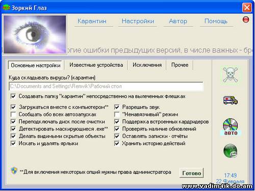| Зоркий глаз - антивирусная утилита класса anti-autorun. Способный обнаружить подавляющее вредоносных программ, обитающих на флешках (даже новых и ранее неизвестных), Зоркий глаз станет отличным дополнением к вашему основному антивирусу. Не требует обновлений вирусных баз, не конфликтует с уже установленными антивирусными продуктами. Дополнительная информация: Файлы, удалённые по ошибке, можно вернуть. Для полезных программ существует список исключений. Зоркий глаз не использует антивирусных баз, а значит, вам не придётся их постоянно обновлять. Другая не менее полезная функция – обнаружение маскирующихся вирусов. Зоркий глаз не проверяет файлы по каким-либо базам, или сигнатурам. Он просто смотрит на них глазами пользователя. И если видит вводящий в заблуждение значок, бьёт тревогу. И наконец – самый драматичный вариант. Вирусы, которые не требуют щёлкать по ним мышкой. Они распространяются через ярлыки (*.lnk) и запускаются сами, пока вы просматриваете содержимое флешки. Заражению подвержены все версии windows без исключения. Не спасёт даже TotalCommander. И вот, учитывая тот факт, что создавать ярлыки на флешках никто в здравом уме не станет (поскольку они будут работать только на родном компьютере), было решено включить в программу функцию, которая находит ярлыки на подключаемых флешках и отправляет из в карантин. Судя по отзывам пользователей, функция со своими обязанностями справляется на все сто! Популярность флешек подарила вторую жизнь троянам, ранее облюбовавшим дискеты. Свою лепту в дело продвижения заразы внесли также разработчики Windows – люди, дети и внуки которых ещё долго будут краснеть и отворачиваться при упоминании Autorun.inf. Правда, британские учёные утверждают, что нашли решение - мол, достаточно поменять несколько значений в системном реестре, поставить на флешку крутую вакцину и всё будет путём, однако такие изменения имеют свои жирные минусы и порой не выдерживают никакой критики. Подробнее о файлах автозапуска и способах борьбы с ними можно почитать здесь. Считается, что обезопасить компьютер от вторжения любых зловредных программ можно установкой дорогого антивирусного пакета. Это верно, но такая защита эффективна не более чем на 10% (ориентировочно). Почему? Всё очень просто. Когда появляется новый вирус, то большинство антивирусных программ, даже при использовании эвристического анализатора, не могут его определить, поскольку сделать своё творение невидимым для большинства распространённых систем защит - основная задача вирусописателя. Новые вирусы распространяются с космической скоростью и инфицируют всё, что попадается на их пути. Вероятность подхватить заразу увеличивается до 90 % По прошествии какого-то времени, пользователи интернета обновляют вирусные базы и лечат компьютеры. После этого заразиться намного сложнее, зловредный код изучен специалистами, выпущены сответствующие исправления и проч. Вот и получается, что (применительно к новым вирусам) антивирусы предназначены только для лечения. А "Зоркий глаз" - это средство для предотвращения заражения компьютера. Чувствуете разницу? Ведь вирус может оказаться "весёлым" и успеет уничтожить, либо зашифровать информацию. Лечить такой компьютер будет уже поздно. Чем он лучше других? Зоркий глаз появился в 2007-м году и был первой программой в своём классе. К н